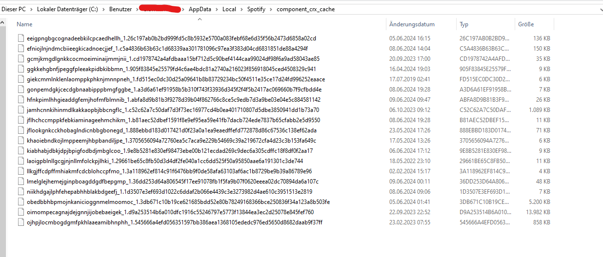 ich hatte gerade eine Meldung vom MS Defender das der gerne eine Datei von der Spotify Desktop App überprüfen will, die Datei lag im C:\Users\BENUTZERNAME\AppData\Local\Spotify\component_crx_cache Verzeichniss