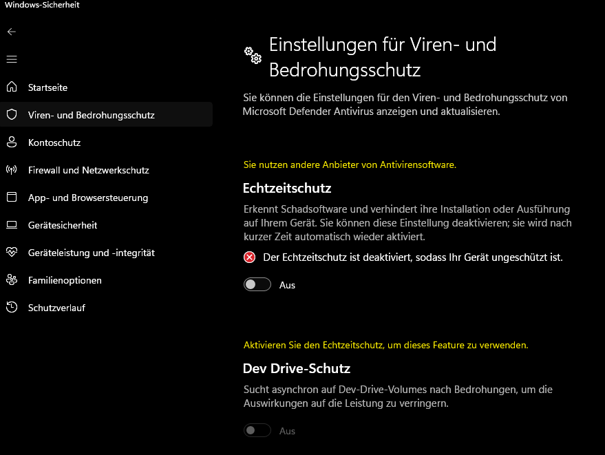 Aber davon mal ab, ist der Dev Drive Schutz komplett ausgegraut, aber der eigentliche Echtzeitschutz scheint doch klickbar zu sein oder nicht?