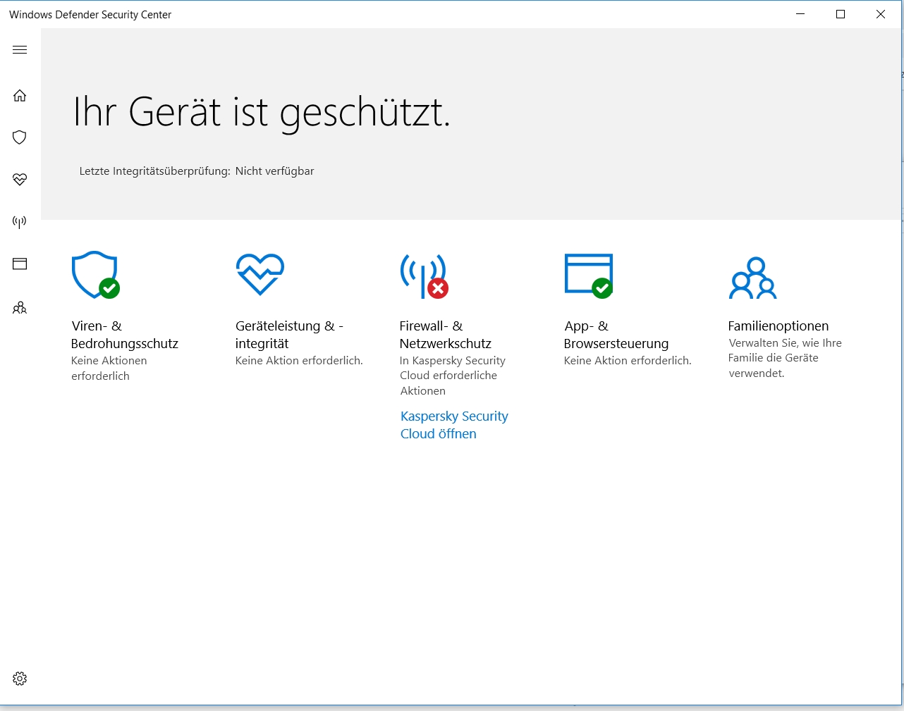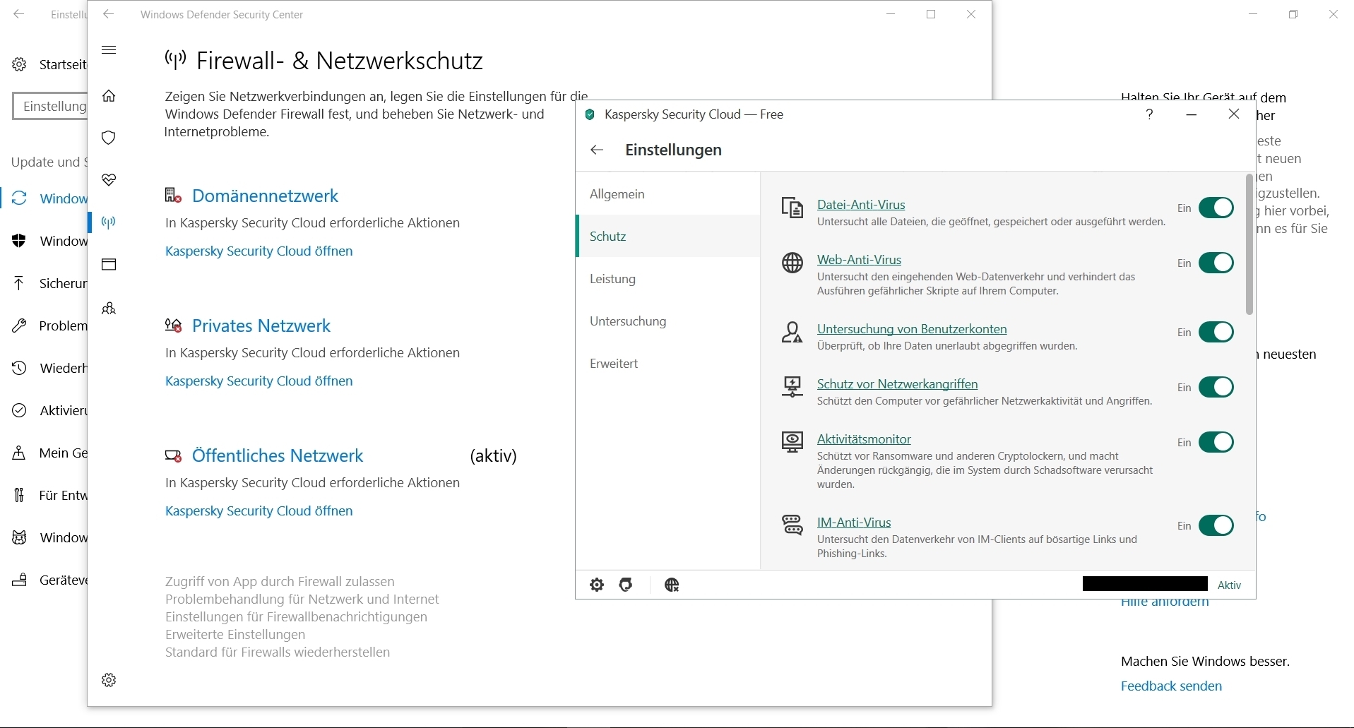 ich sehe im Windows Defender Security Center eine Fehlermeldung, wegen einer "In Kaspersky Security Cloud erforderliche Aktionen" aber in Kaspersky sieht soweit alles in Ordnung aus daher kann ich nicht nachvollziehen wo das Problem liegen soll.