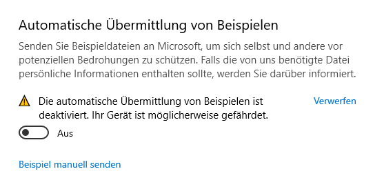 Ich nutze als AV-Lösung den im Windows integrierten Defender, habe jedoch die "automatische Übermittlung von Beispielen" deaktiviert: