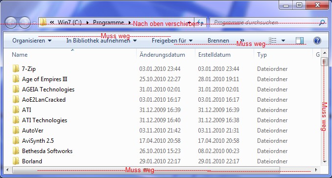 1) Ich bin gerade dabei den Windows Explorer umzugestalten: Siehe Bild. Als Scrollleistenersatz habe ich ja das Mausrad. Für die horizontale Scroll-Leiste bräuchte ich sowas wie Taste+Mausrad-->Horizontal scrollen. Diese komische Leiste, wo "Organisieren" steht muss ganz verschwinden, denn sie bringt mir absolut nichts. Die Adressleiste mit Suchleiste würde ich gerne um eine Zeile nach oben verschieben, denn da hats ja noch Platz.