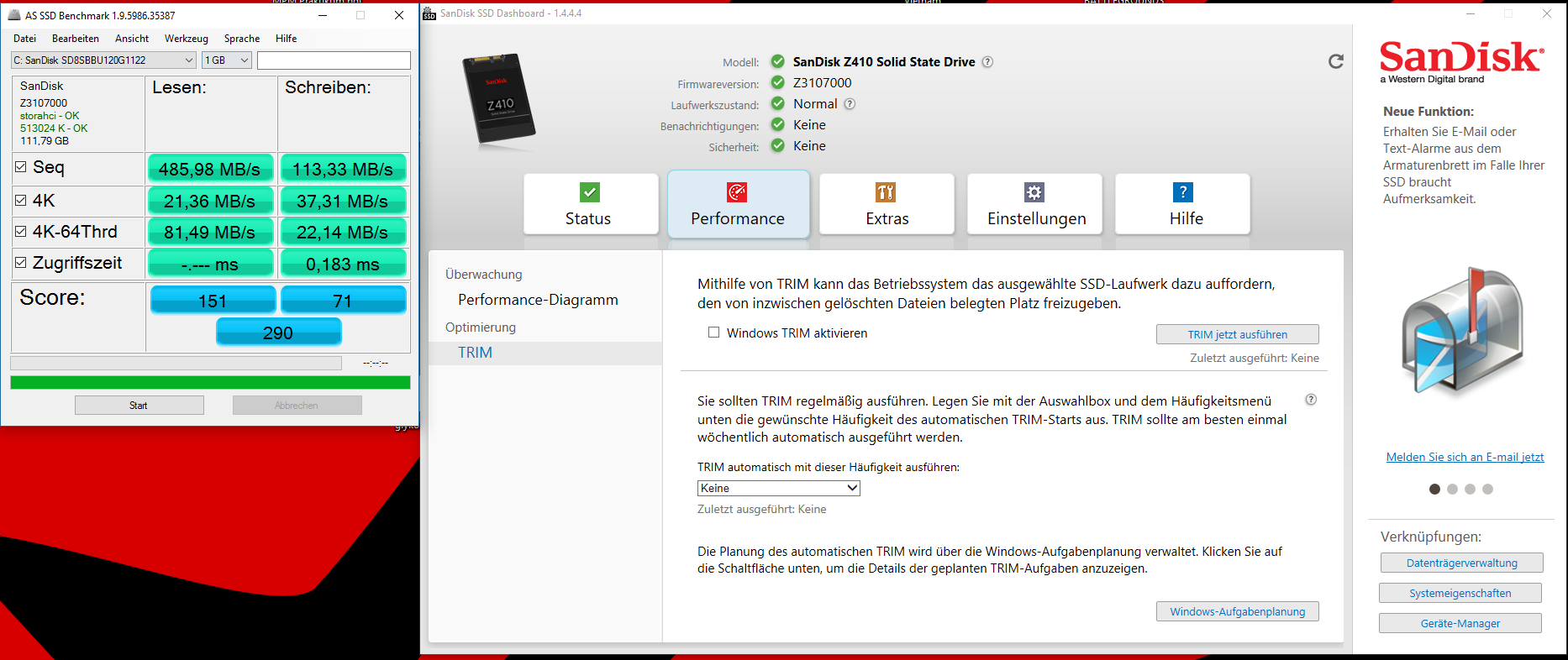 Es ist eine Sandisk Z410 120 GB auf der Windows 10 installiert ist.