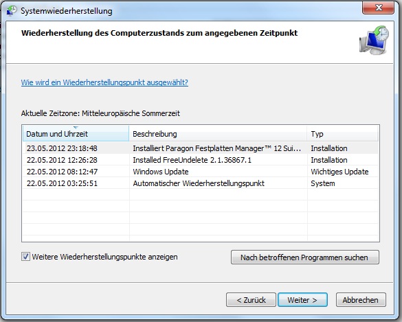 Über das Wiederherstellungsmenü der Disk habe ich das gleiche gesehen wie in der Systemsteuerung, leider ist der letzte Punkt erst am Tag nach dem Crash gesetzt worden und ältere gibt es leider nicht.