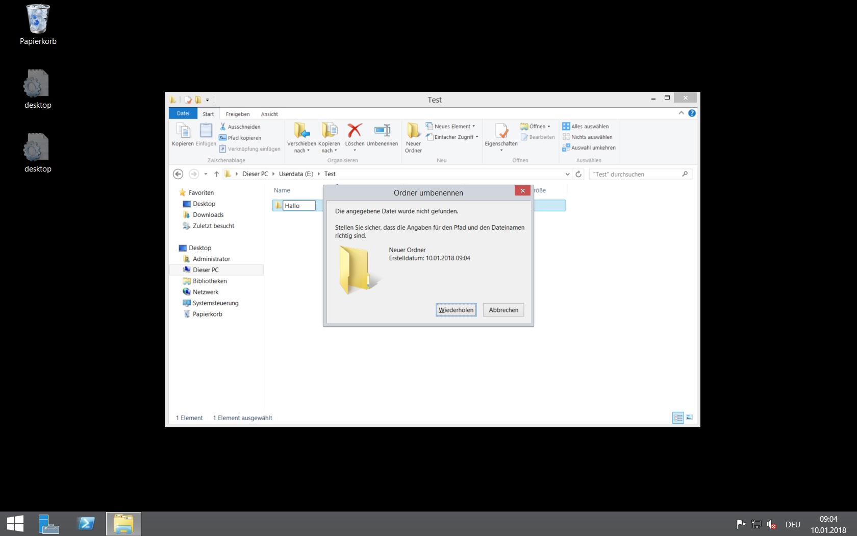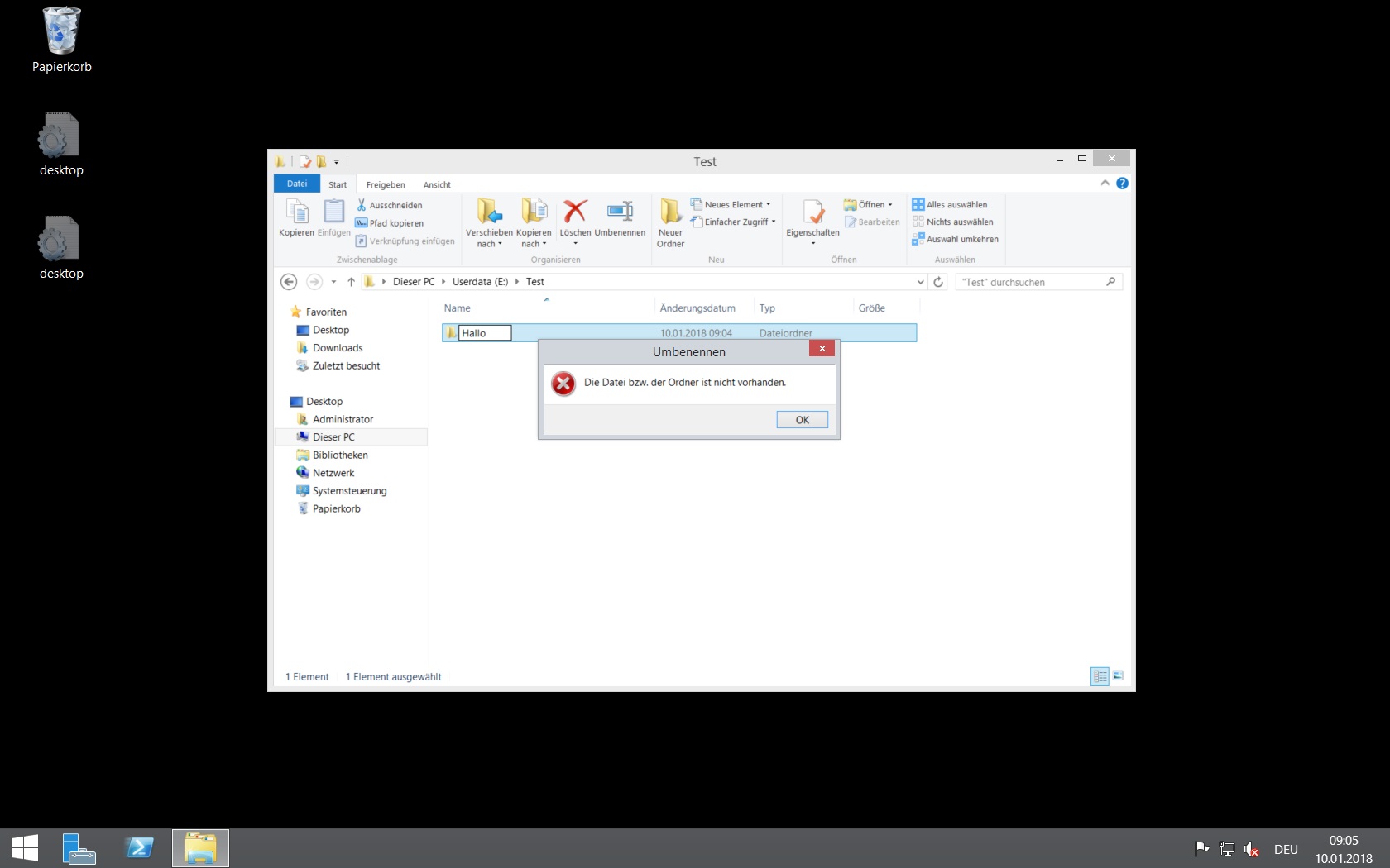 Auf unserem File-Server (Windows Server 2012 R2) kann man mit dem Windows Explorer keine Ordner umbenennen und verschieben. Wenn man einen Ordner erstellt heißt er auch gleich Neuer Ordner und kann nicht umbenannt werden. Umbenennen funktioniert nur mit der Powershell oder cmd.