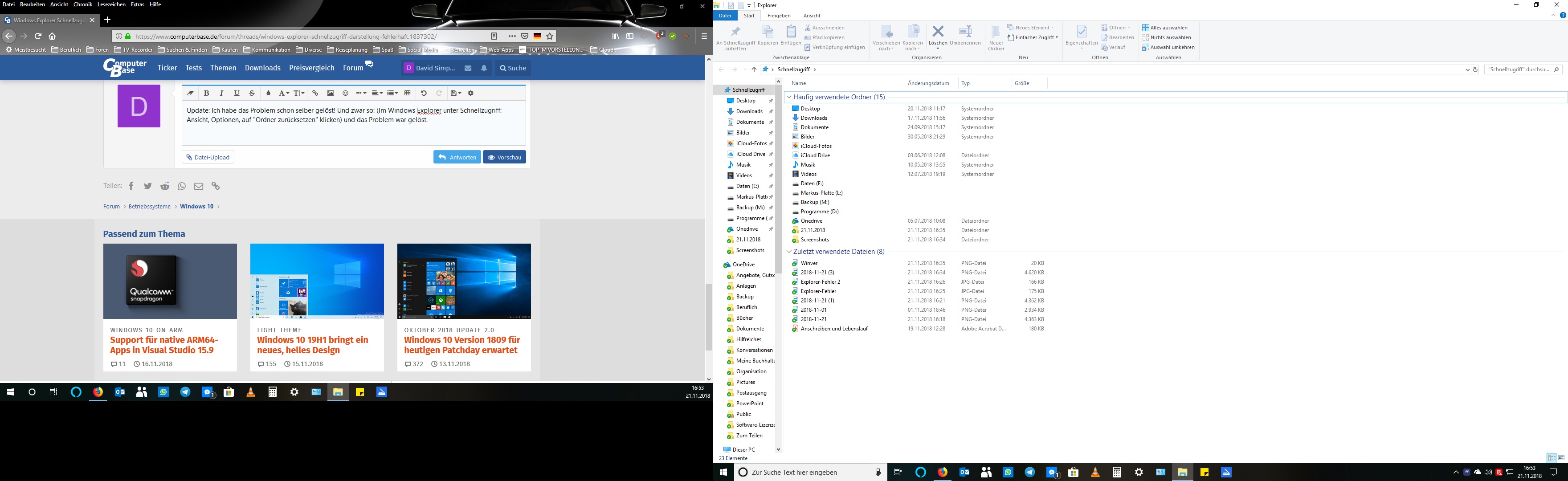 wie der Titel schon sagt ist bei mir seit heute die Darstellung im Windows Explorer fehlerhaft. Das heißt der Schnellzugriff und die zuletzt verwendeten Dateien sind vermischt. Zum besseren Verständnis habe ich einige Screenshots beigefügt.