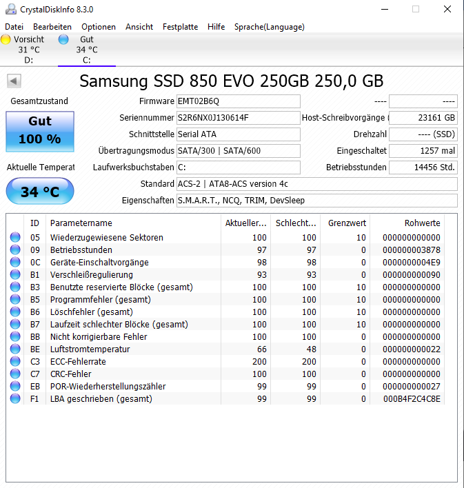SSD: SAMSUNG SSD 850 EVO 250GB (Hier ist Windows installiert)
