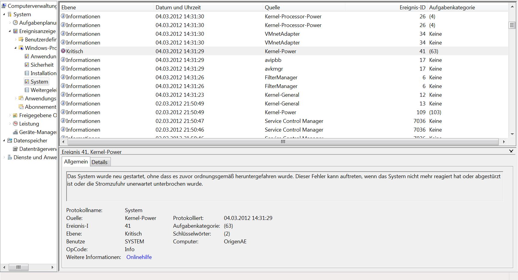 Bei der Windows-Ereignissanzeige (siehe Bild) ist der Fehler der durch den benötigten Hardreset ausgelöst wird anscheinend das erste Ereignis. Die Vorgänge die vor dem Freeze abliefen sehe ich gar nicht!