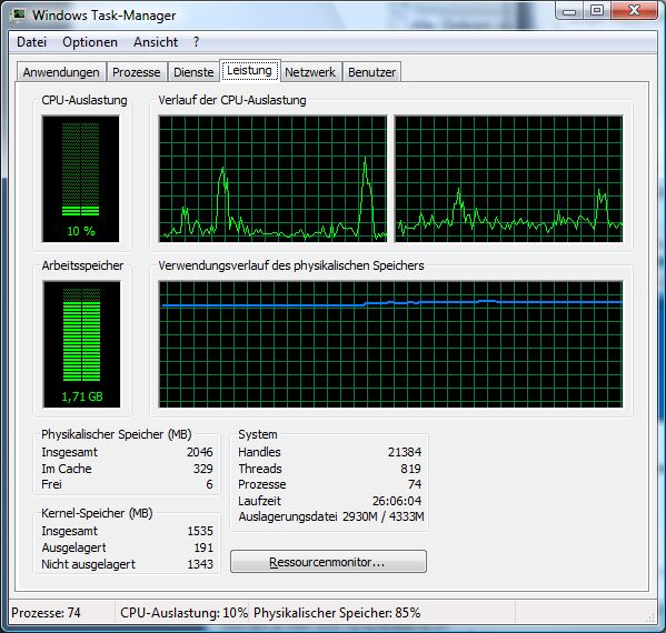 Lasse ich den Rechner dann übrigens die Nacht laufen und komme am nächsten Morgen, ist er meistens abgeschmiert bzw. hat sich neu gestartet - infolge Speicherüberlaufs.
