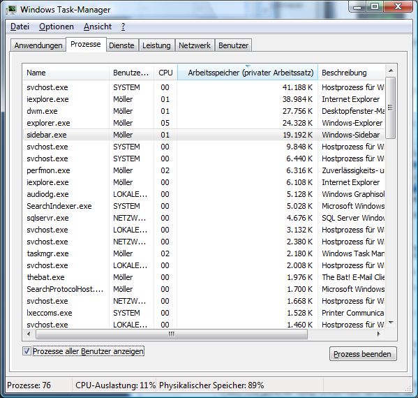 Reiter 'Prozesse': Summe der von Progr. benötigter RAM-Speicher ca. 90 MB.