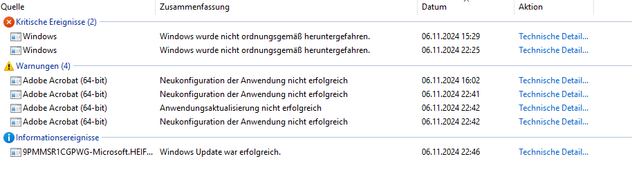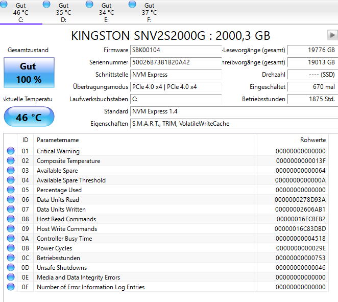 CrystalDiskInfo zeigt an, dass alle Festplatten bei 100% Health sind. Der Screenshot von der C Festplatte ist angehängt, ebenso Ereignisanzeigenlogs.