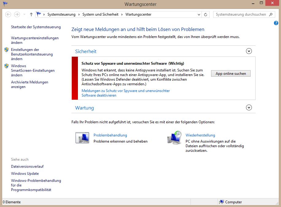 Nun bekomme ich plötzlich die von Windows die Meldung, dass keine Antispyware installiert ist.