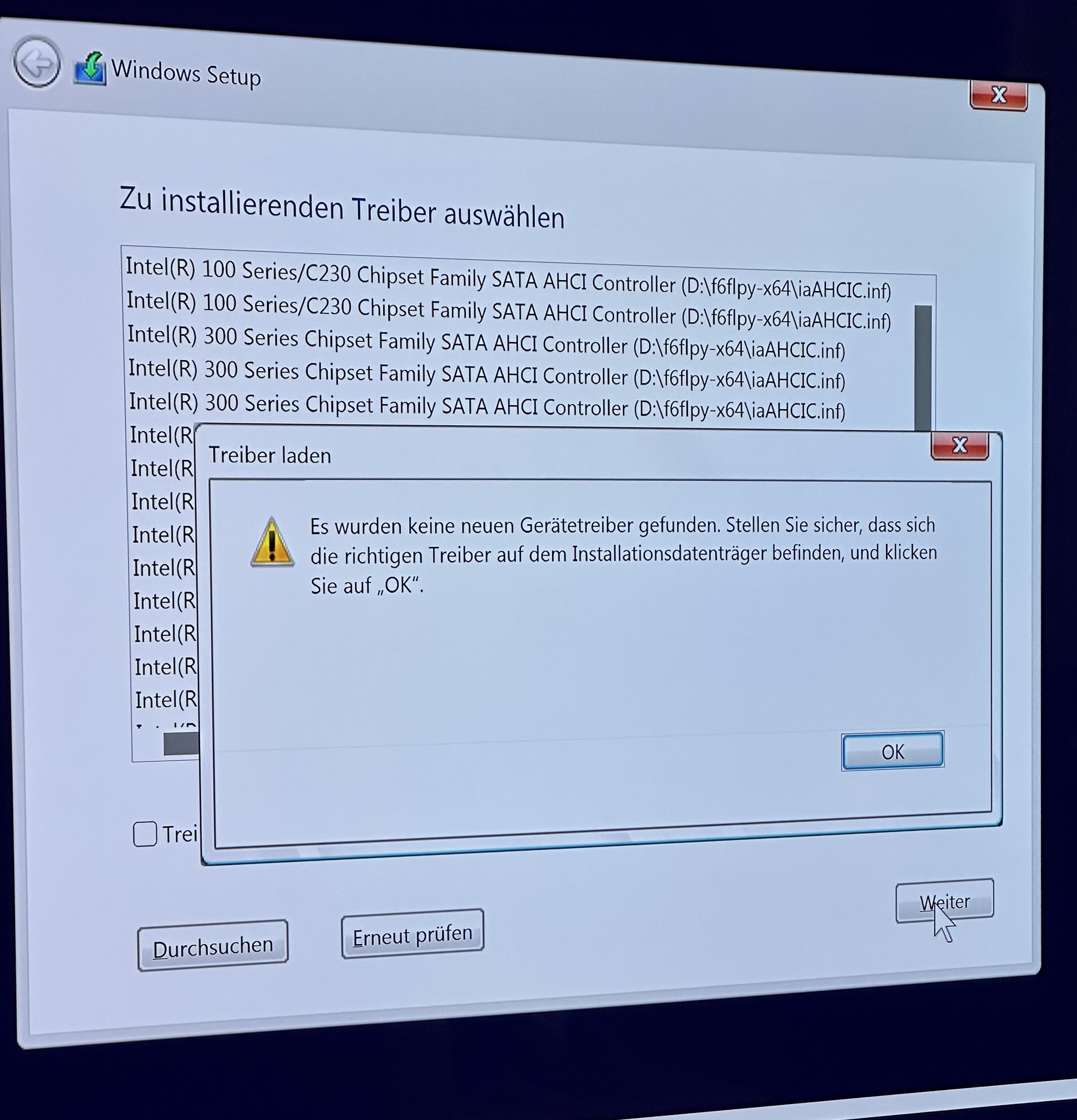 „Ein für den Computer erforderlicher Medientreiber fehlt. Dies kann ein DVD-, USB-oder Festplattentreiber sein. Falls Sie eine CD, DVD oder einen USB-Speicherstick mit dem Treiber haben, legen Sie die CD oder DVD jetzt ein, bzw. schließen Sie den USB-Speicherstick an.“
