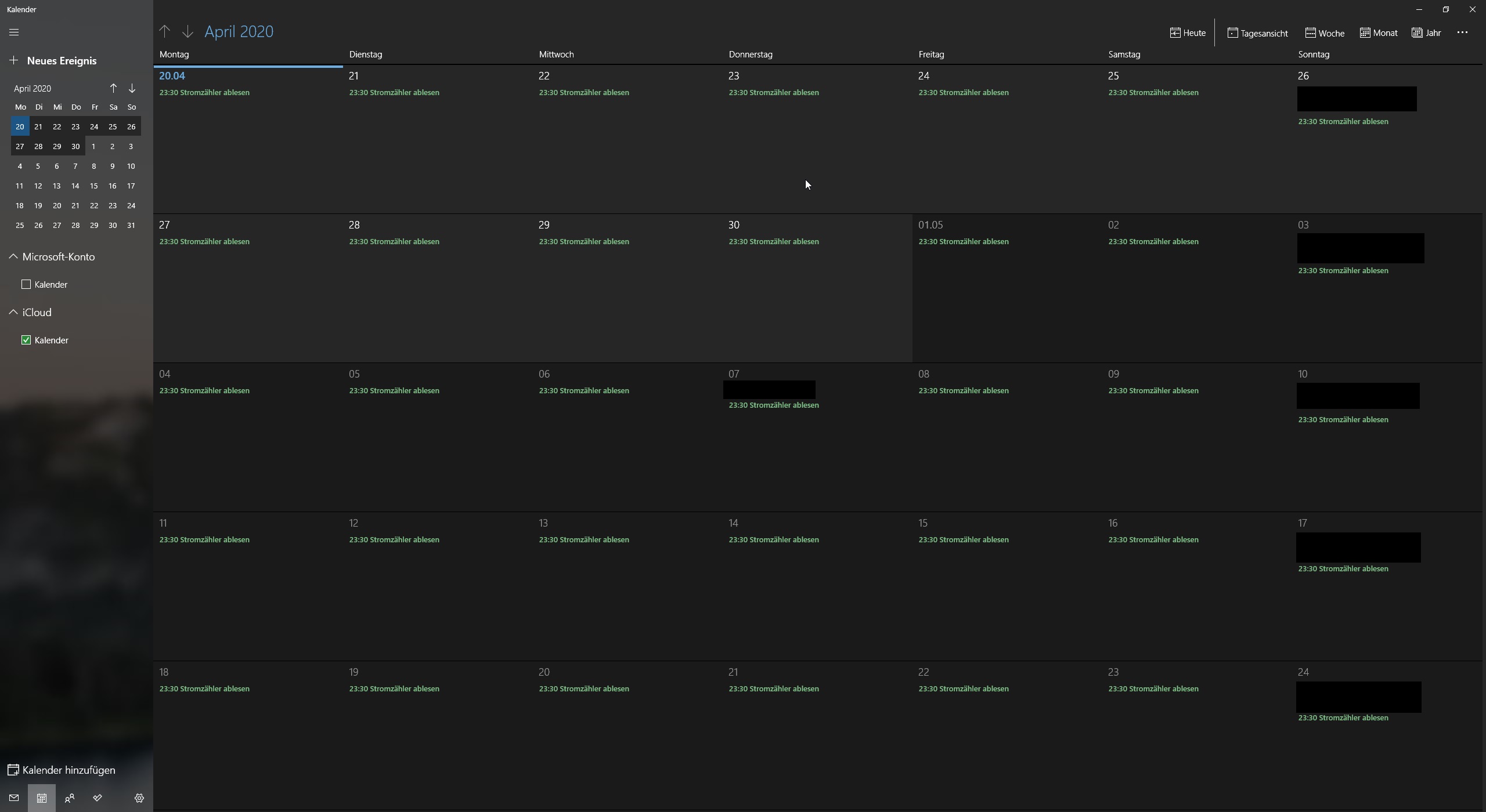 Dieses iCloud-Konto habe ich auch in Windows 10 Pro im Kalender eingetragen und die Einträge werden auch synchronisiert und eingetragen in Win10. Bei einem Eintrag, der sich alle 3 Wochen wiederholt, gibts keine Probleme - dieser wird alle 3 Wochen korrekt angezeigt. Allerdings bei einem Eintrag, der immer zum Ende eines Monats ist ( also immer am letzten Tag des aktuellen Monats ), wird dieser mir jeden Tag im ganzen Monat angezeigt.