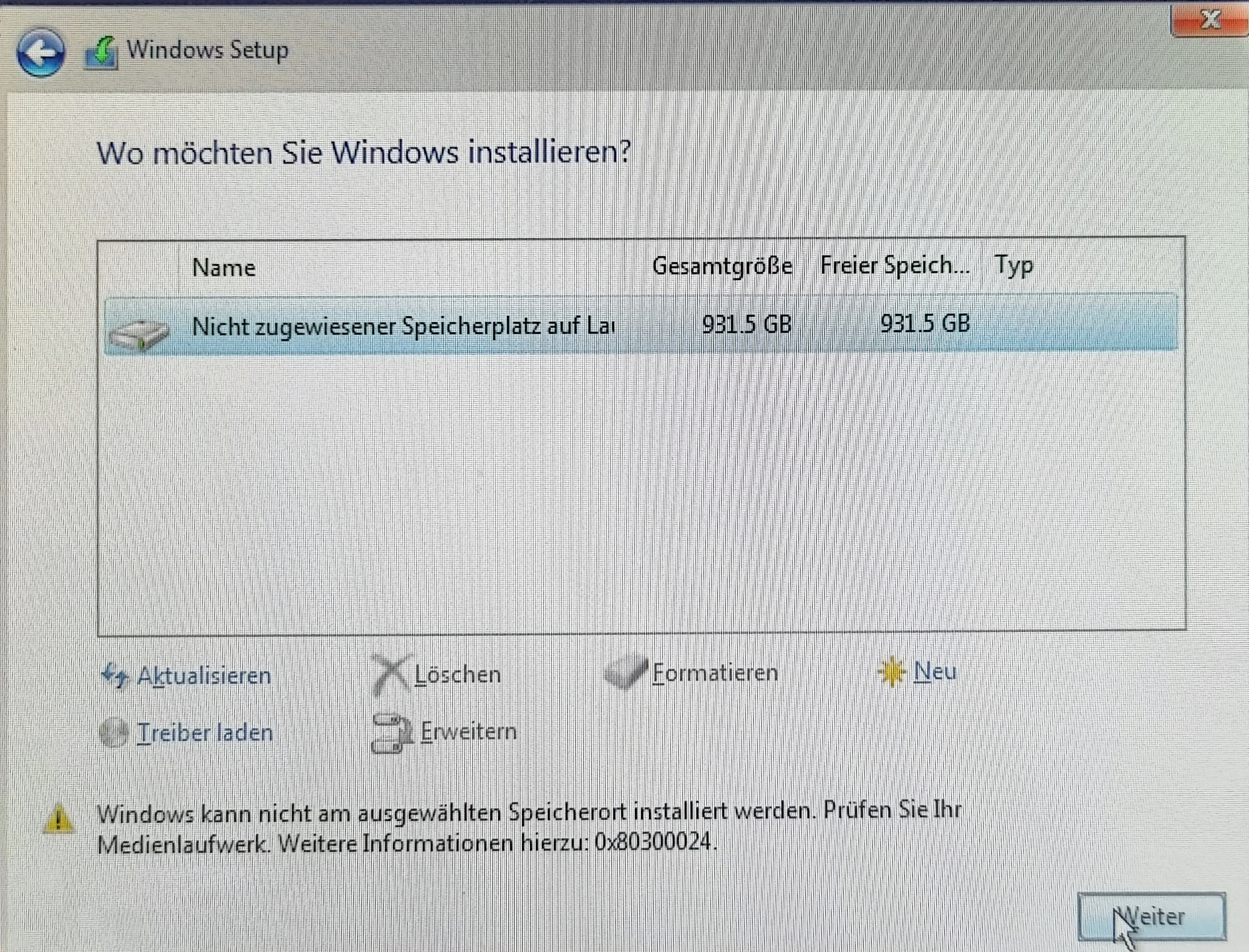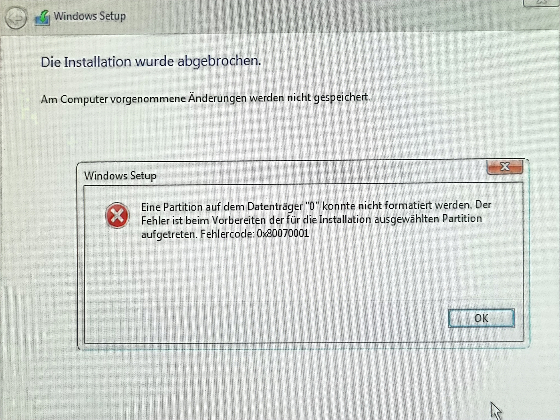 Die Festplatte wird zwar im Bios und im Installationssetup erkannt, sobald man aber die Installation starten möchte, schmiert er ab. (Fehlercode 0x80070057)