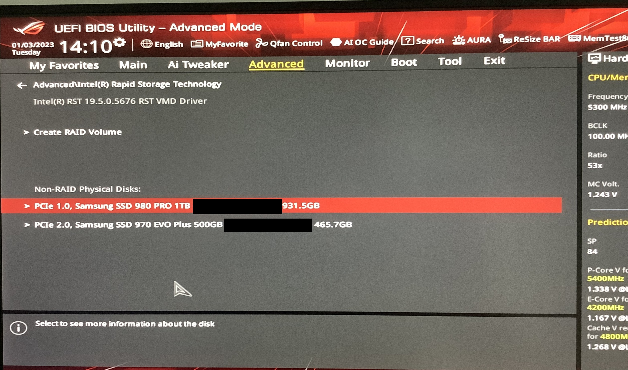 - HDD / SSD: SAMSUNG 980 PRO 1TB (M2_1) mit Win10 & SAMSUNG 970 EVO Plus 500GB (M2_2)