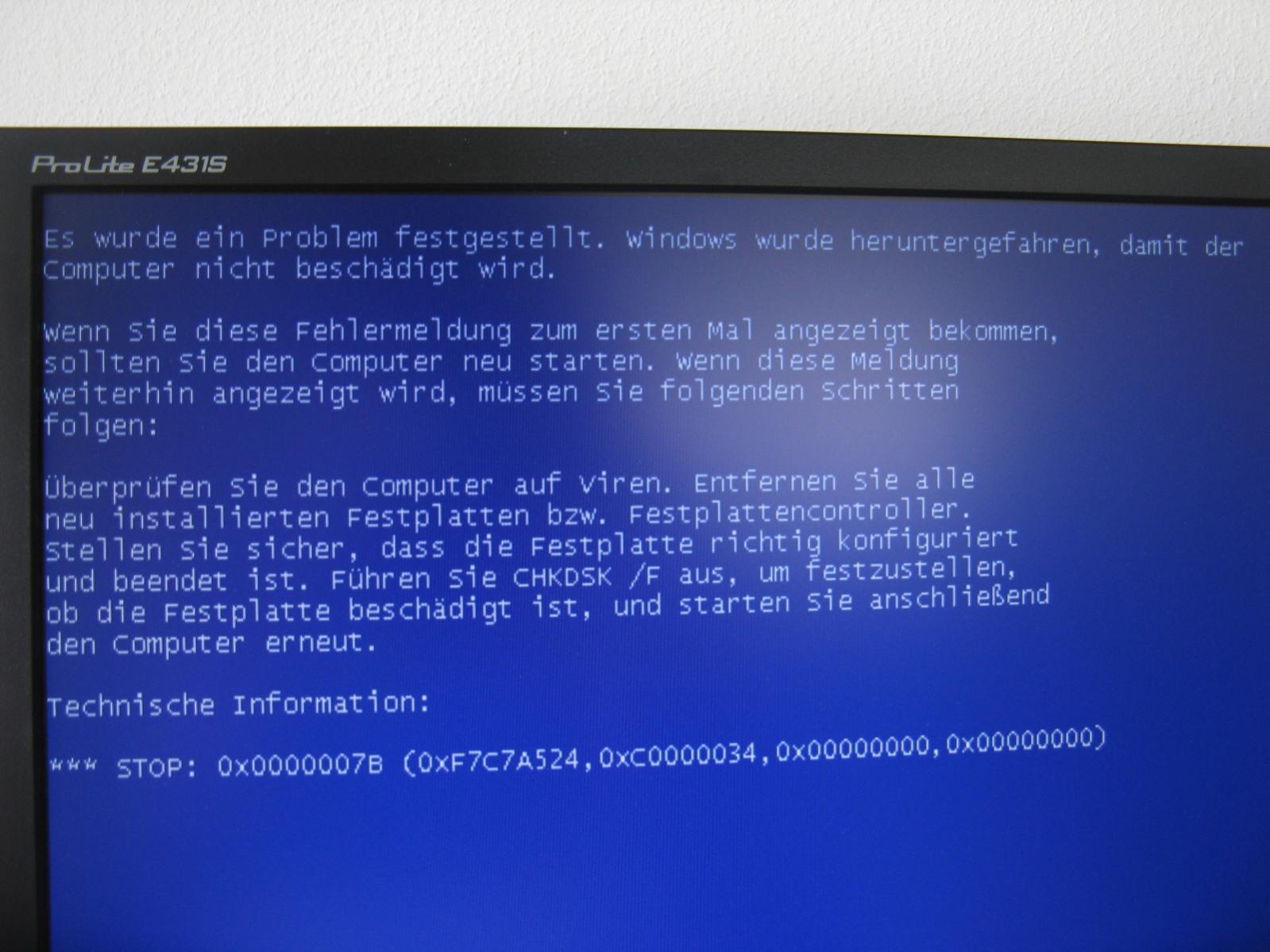 Wenn ich dann von Windows CD Starten will, läuft der "Check" für die ganzen Treiber und so durch (Blauer Bildschirm mit dem grauen Rand unten), hält bei NTFS Dateisystem an und es kommt wieder der Bluescreen von wegen "Es wurde ein Problem festgetellt...runtergefahren damit Computer nicht geschädigt wird". (Bild folgt)