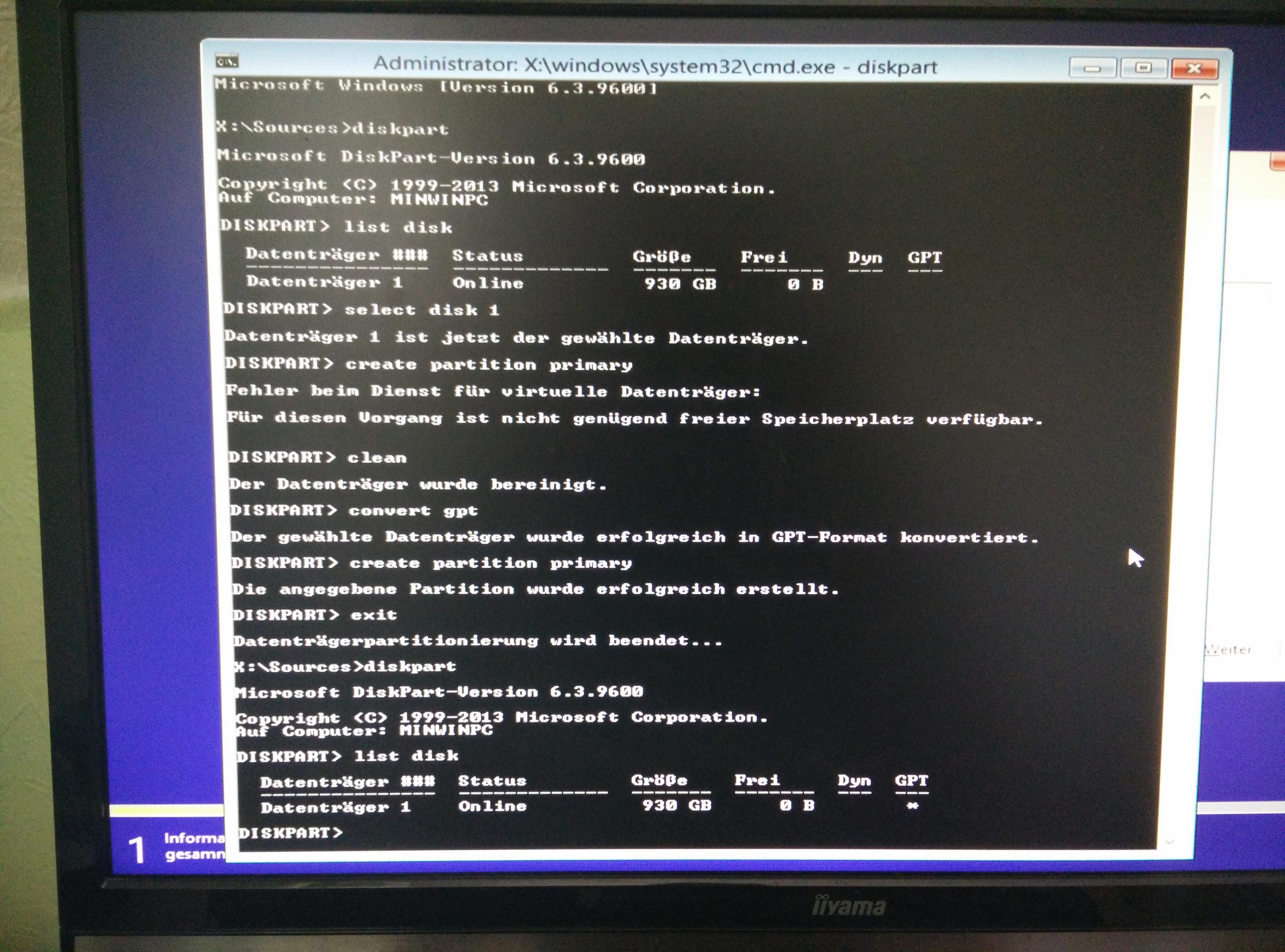 Ich habe auch schon viel gegoogelt und versucht im "Windows-Installations-Fenster" mit Umschalt+F10 den Datenträger nochmals zu formatieren und zu cleanen und den gpt Modus einzustellen (Informationen aus dem Internet), leider ohne Erfolg.