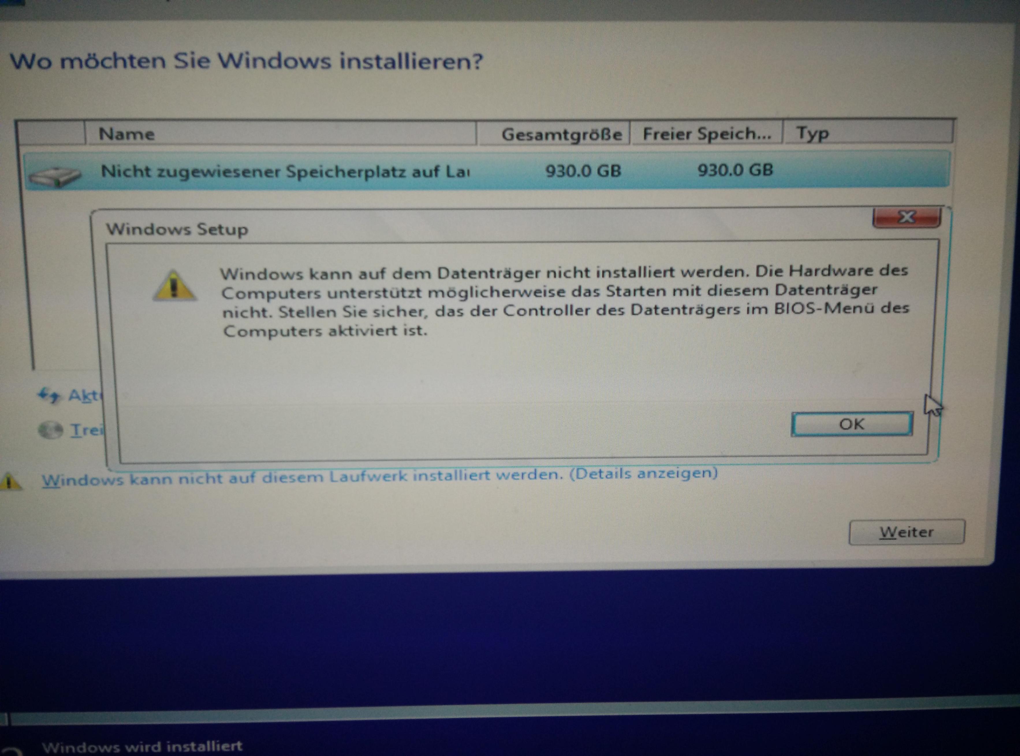 Der Fehler lautete ungefähr so "Windows kann nicht auf dem Datenträger 1 Partition 1 installiert werden" Dann war unten noch so ein Hilfe Button, da stand etwas von, dass man die Einstellungen im BIOS richtig beachten soll.