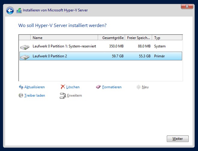 Ich würde gerne HyperV Core auf einen Server installieren. Allerdings habe ich grosse Probleme mit der Installation. Jedesmal wenn ich im Windows-Setup Menü, das RAID anwähle, auf welches HyperV installiert werden soll kommt die Meldung "We couldn't create a new partition or locate an existing one". Zuerst dachte ich mir, es muss daran liegen, dass der Server keine Bootpartitionen über 2TB unterstützt. Darauf habe ich aus dem Raid zwei seperate Volumes erstellt, ein 40GB Volume fürs System und der Rest für die Daten.