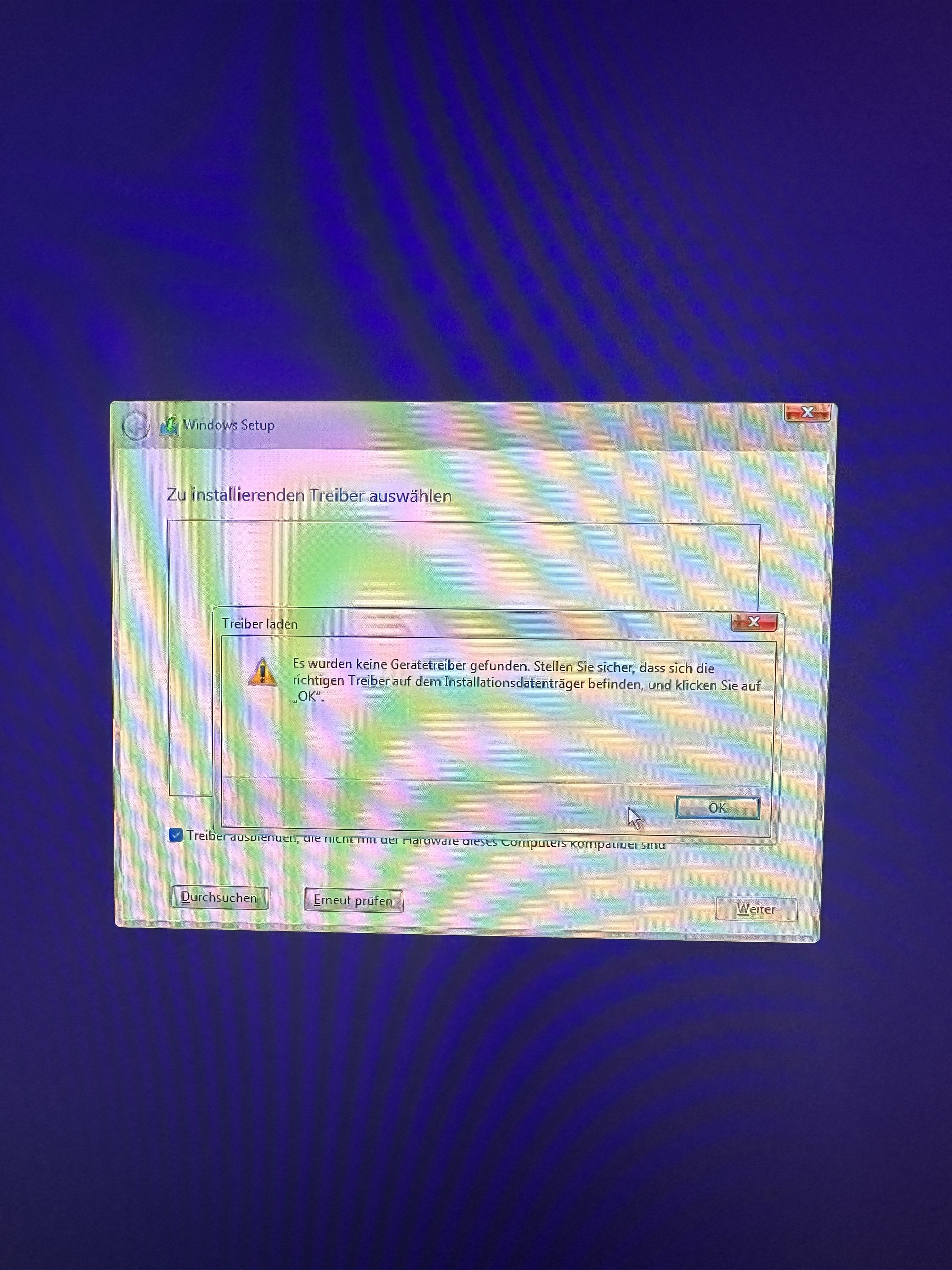 Pc bootet über USB Stick und wenn ich Windows 11 installieren will, bekomme ich die Fehlermeldung „ Es wurde kein Gerätetreiber gefunden. Stellen Sie sicher, dass sich die richtigen Treiber auf dem Installationsdatenträger befinden und klicken sie auf ok.