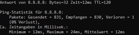 Ich habe auch einen anderen Router angeschlossen. Nicht mal die Login-Daten umgestellt(und der Nutzer ist bei einem ganz anderem Provider) - funktionierte überraschenderweise trotzdem direkt. (Ping-Test läuft im Hintergrund gerade). Jedoch konnte ich 8.8.8.8 nicht anpingen. Ich habe dann www.google.de angepingt. Das klappt. Die Adresse lautet dann: "Antwort von 2a00:1450:4016:808::2003: Zeit=17ms". Den Router selbst - der sollte IP 192.168.178.1 haben konnte ich aber nicht ansteuern(wie kann ich die IP-Adresse des Routers heruasfinden?). Aber per fritz.box ging es. Musste dort aber nicht umstellen. Alles irgendwie merkwürdig.