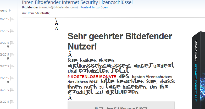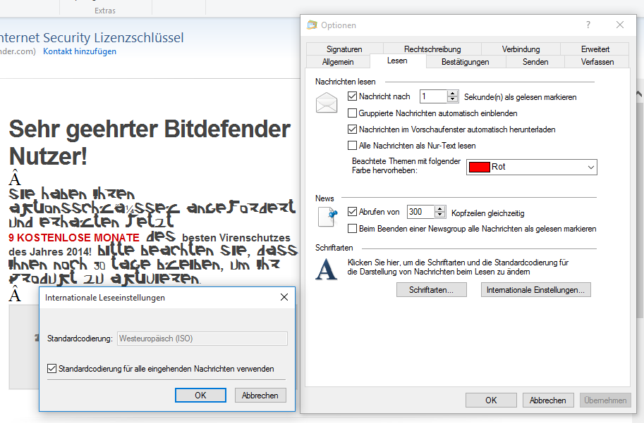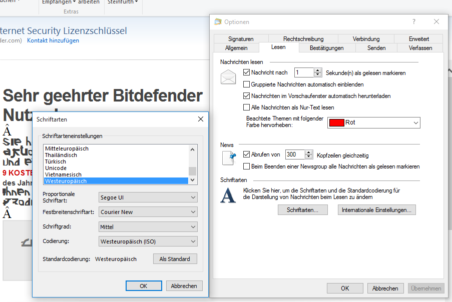 ich habe seit ein paar Tagen Probleme mit der Schriftart beim Lesen meiner Emails. In den Optionen ist auch alles richtig eingestellt was die schriftart betrifft. Kann mir jemand helfen wie ich das so hin bekomme das die schriftart wieder normal ist? Einige Mails werden korrekt dargestellt und einige mit so einer komischen schriftart. (Siehe Bilder)