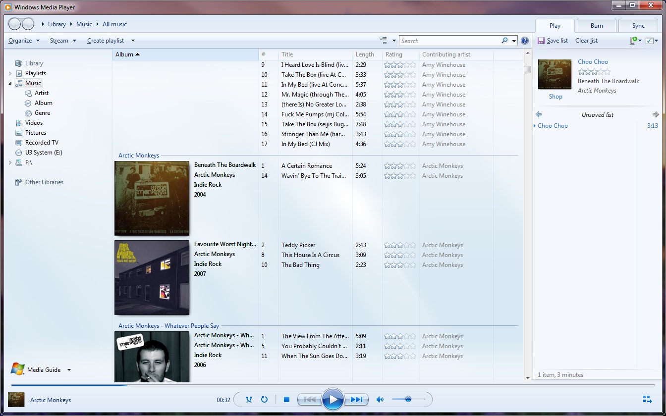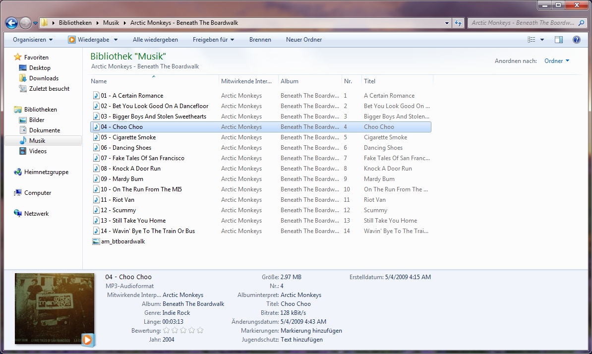 merkwürdiges problem. der windows media player sortiert/ordnet den bestand ziemlich schlecht/unvollständig. öffne ich den ordner von "arctic monkeys" werden alle tag's wunderbar angezeigt. siehe bild. der wmp aber kann scheinbar die tag's nicht korrekt auslesen. er zeigt zb. 2 titel vom "arctic monkeys" album korrekt an und setzt den rest auf unbekannt. wenn ich aber eine mp3, welche er in unbekannt setzt (z.b. aus dem arctic monkeys album, titel 4 "choo choo"), aus dem ordner heraus starte bzw. abspiele, wird in der playliste alles korrekt angezeigt. siehe bild (album, titel und interpret). warum also kann er das nicht auch in der library vernünftig anzeigen?!