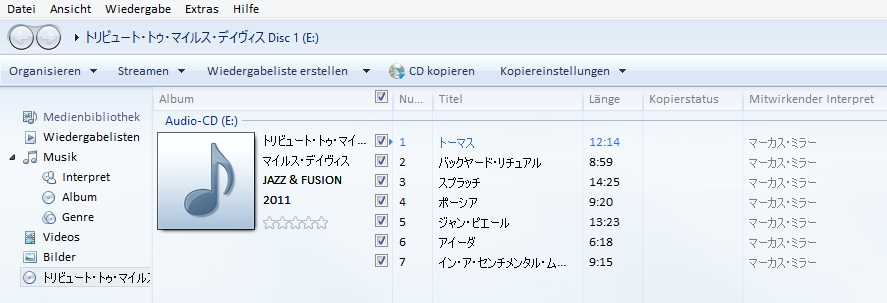 ich habe folgendes Problem: Wenn ich eine Audio-CD per Windows-Media-Player in Mp3-Dateien auf die Festplatte übertragen will und die CD einlege, sucht der Player ja standardmäßig nach den Albuminformationen. Das hat auch alles bisher geklappt, nur neuerdings sind die Albuminformationen (Name und Titel) in asiatischen Schriftzeichen. Betriebssystem ist Windows Vista. Auf einem anderen Rechner mit Windows 7 besteht genau das gleiche Problem. Wodran liegt das genau und wie kann man das Problem lösen? Nach Einstellungen, woher der Player die Informationen bezieht habe ich vergeblich gesucht.