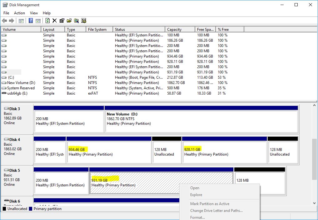 Als Beispiel habe ich Euch mal einen Screenshot angehängt. Die Gelb hervorgehobenen Partitionen sind 2x NTFS und einmal exFAT. Beim Rechtsklick kann ich nichts machen, wie man sieht. Disk 4 mit den 934,5 GB ist übrigens die alte Windows 7 Partition.