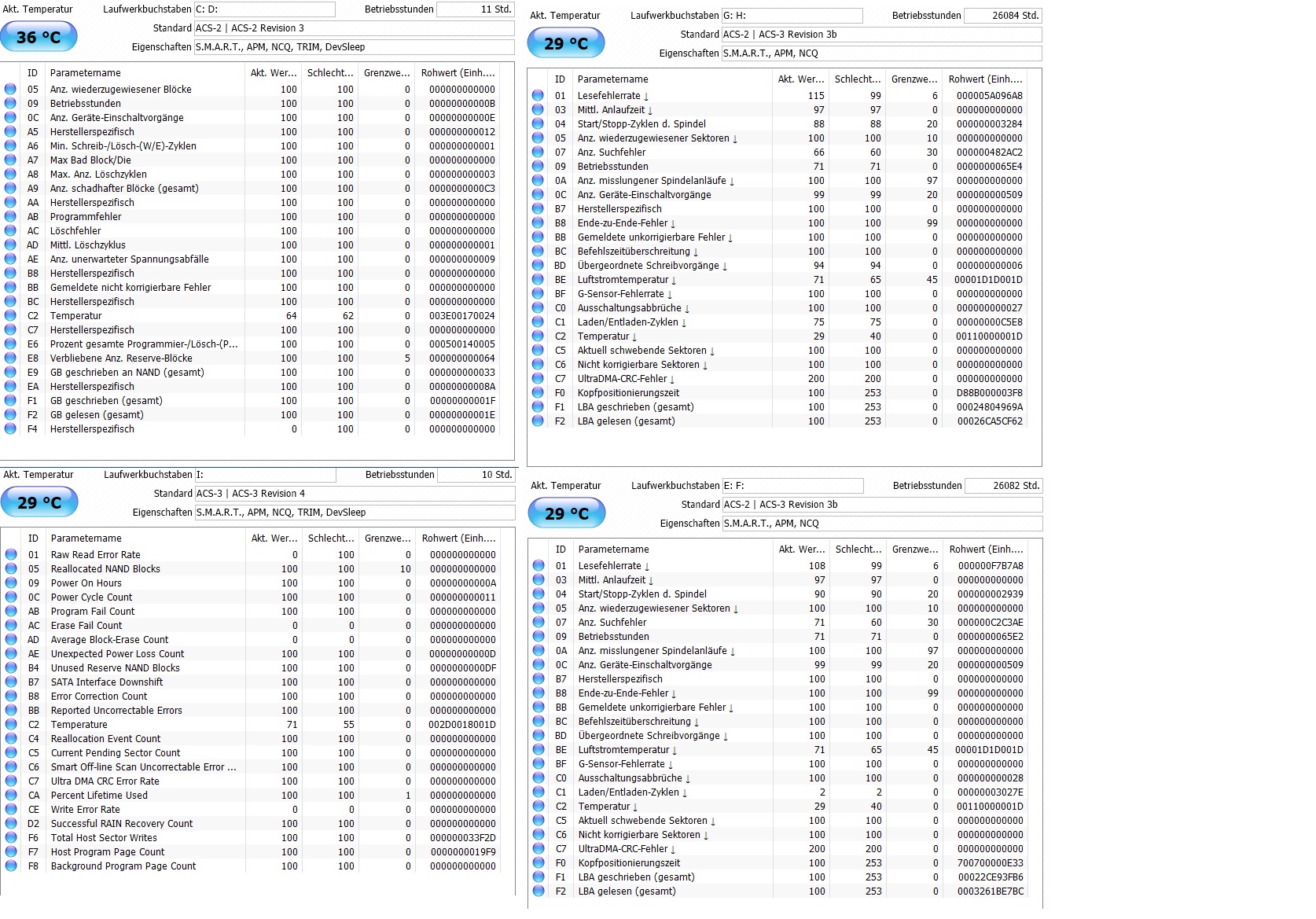 Interessant wären die Einträge unter C7 UltraDMA-CRC-Fehler. Damit könnte man schon einem defekten Kabel auf die Schliche kommen.