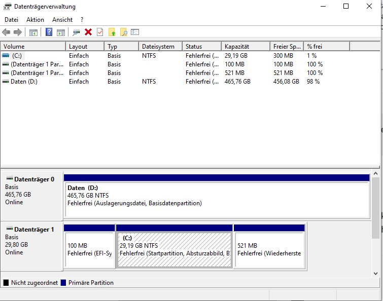 Die Datenträgerverwaltung zeigt ein Volume:C mit 29,19 GB und ein VolumeD: mit 465 GB an.