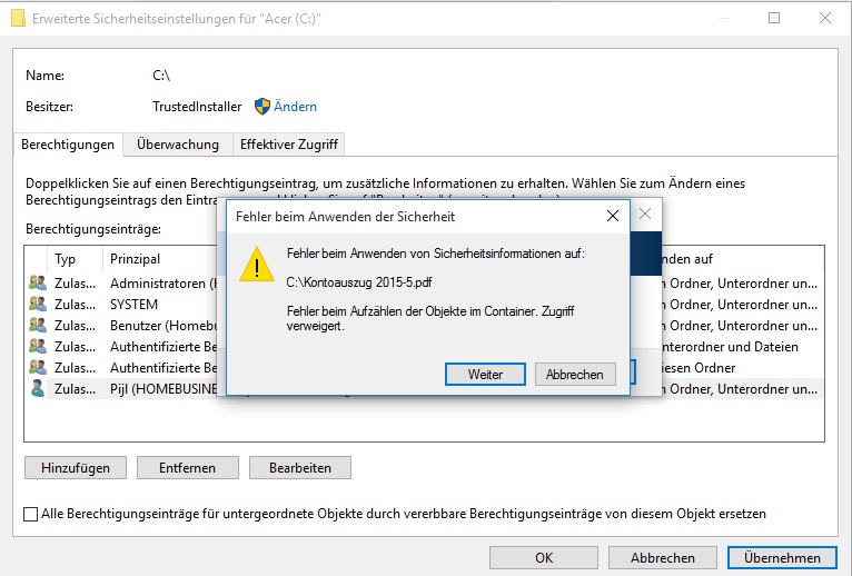 Hmm, bei den Sicherheitseinstellungen der C-Partition habe ich nun einen neuen Benutzer mit Vollzugriff eingerichtet.
