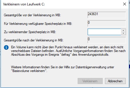 Leider ging das nicht. Aus irgend einem Grund ließ sich die NTFS-Partition trotz viel freiem Speicher nicht verkleinern (Siehe Bilder).