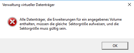Ich habe ein Problem unter Windows 10, ich habe 2 Festplatten, eine mit 750 GB und eine mit 300GB. Auf der Platte mit 300 GB gibt es eine Partition auf der Windows installiert ist, diese Partition möchte ich gerne auf die 750 GB HDD spiegeln. Diese Festplatte hat noch keine Partition. Nun das Problem: Rechtsklick auf die "Windows" Partition - Spiegelung hinzufügen - Datenträger auswählen - Fehlermeldung: "Alle Datenträger, die Erweiterungen für ein angegebenes Volume enthalten, müssen die gleiche Sektorgröße aufweisen, und die Sektorgröße muss gültig sein." (siehe Bild)