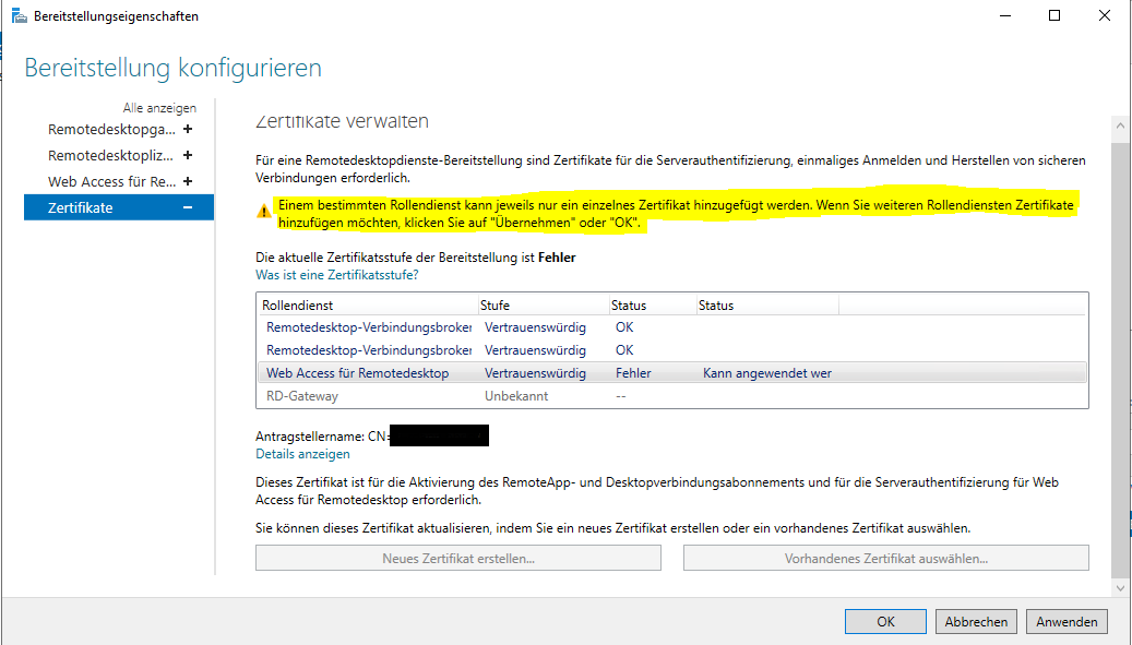 Ich habe einen Windows Server 2012 R2 welcher als TerminalServer mit sitzungsbasierter Desktopbereitstellung dient. Alles funktioniert soweit und nun sollen RemoteApps realisiert werden, weshalb wir ein SSL-Zertifikat hinterlegen müssen. Das Zertifikat wurde selber korrekt erstellt und funktioniert auf einem Testserver tadellos. Im Servermanager bei Remotedesktopdienste unter Aufgaben findet man dann die Bereitstellungskonfiguration wo man unter Zertifikate jeweils für den Host, den Broker und den RDWeb das Zertifikat einbinden kann. Es funktioniert beim Host und Broker, doch dann beim Webservice kommt ein Fehler:"Das Zertifikat konnte auf mindestens einem Server nicht konfiguriert werden. Stellen Sie sicher, dass die Server im Netzwerk verfügbar sind, und wenden Sie das Zertifikat erneut an".