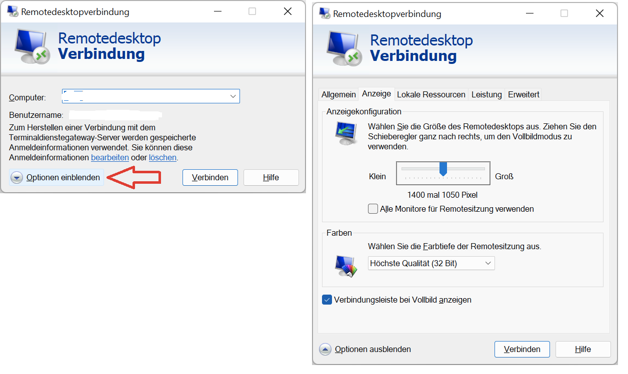 - Die RDP Datei, die mir zugeschickt wurde hat keinen Reiter um die Bildschirmauflösung zu ändern (Siehe Screenshot).