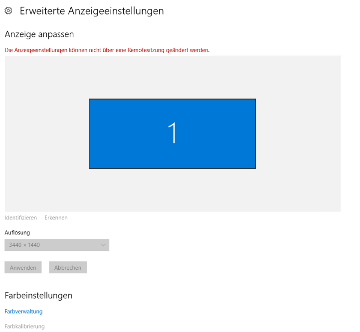 ich habe ein Problem und zwar habe ich einen Ultra Curved Monitor (3440x1440x) und mache aktuell eine Weiterbildung und habe dafür eine Testumgebung bekommen (Windows Server 2016), leider kann ich die Bildschirmauflösung nicht ändern. Das nervt wirklich sehr die RDP Session übernimmt meine 3440x1440 Auflösung, ich würde die Auflösung gerne z.B. auf 1920x1080 umändern. Ich habe einen Tag lang recherchiert und folgende Methoden leider erfolglos ausprobiert: