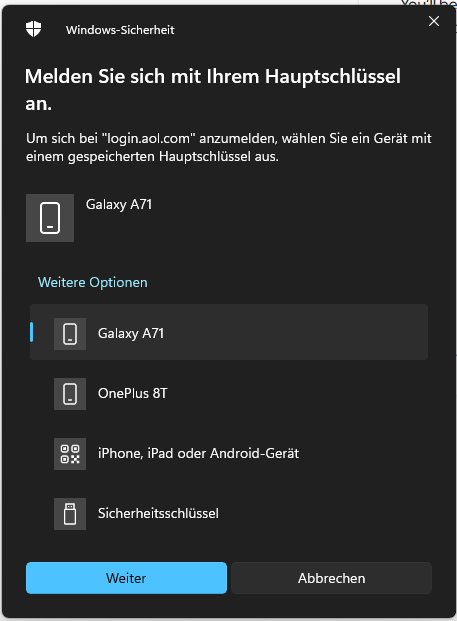 Ich würde gerne wissen, wie man dieses Fenster entfernt oder bearbeiten kann und warum es kommt. Geht es hier um Passkeys? Wie auf dem Bild zu erkennen versuche ich mich bei aol einzuloggen (was auch geht, mit Passwort wenn ich das Fenster weg klicke) Ebenfalls habe ich dort überhaupt keinen passkey aktiviert in den Einstellungen, bei diesem Email Anbieter.