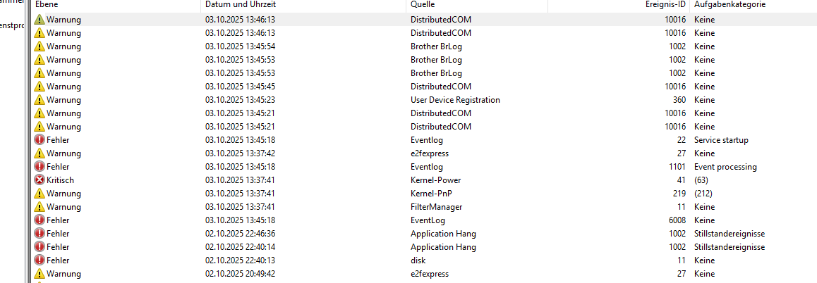 Die Ereignisanzeige meldete für gestern abend und heute nachmittag Fehler entsprechend dem screenshot.