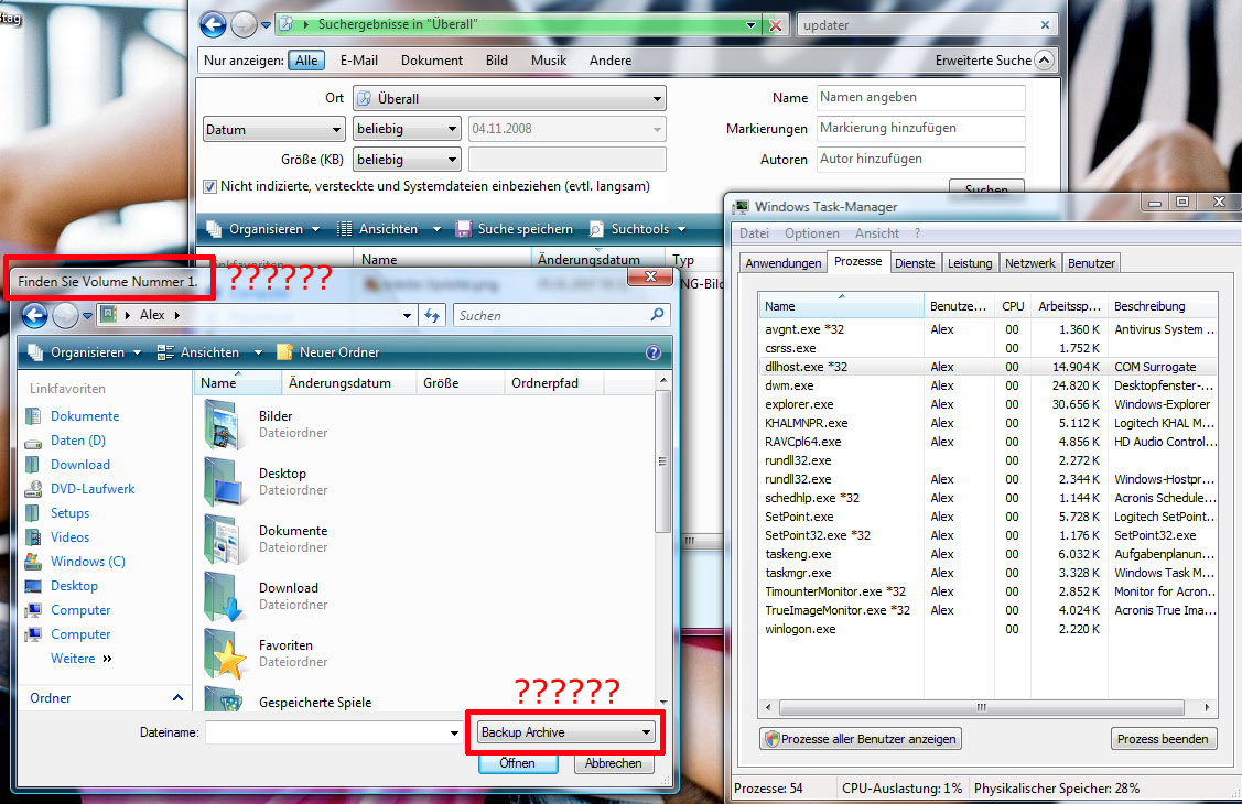 Ich hab heute was mit der Suche unter Vista gesucht. Klappe ich den Suchbereich im Windows Explorer auf, kann man ja aus der Liste "Überall" wählen und die nicht indizierten Dateien mit einschließen. Sobald ich beides makiert habe startet Windows die Suche wie gewohnt mit den neuen Optionen. Nur kommt auf einmal ein komisches Fenster, das nach einem "Volume Nummer 1" in Form eines "Backup Archivs" frägt. Ich soll also irgend eine Backup Datei öffnen.