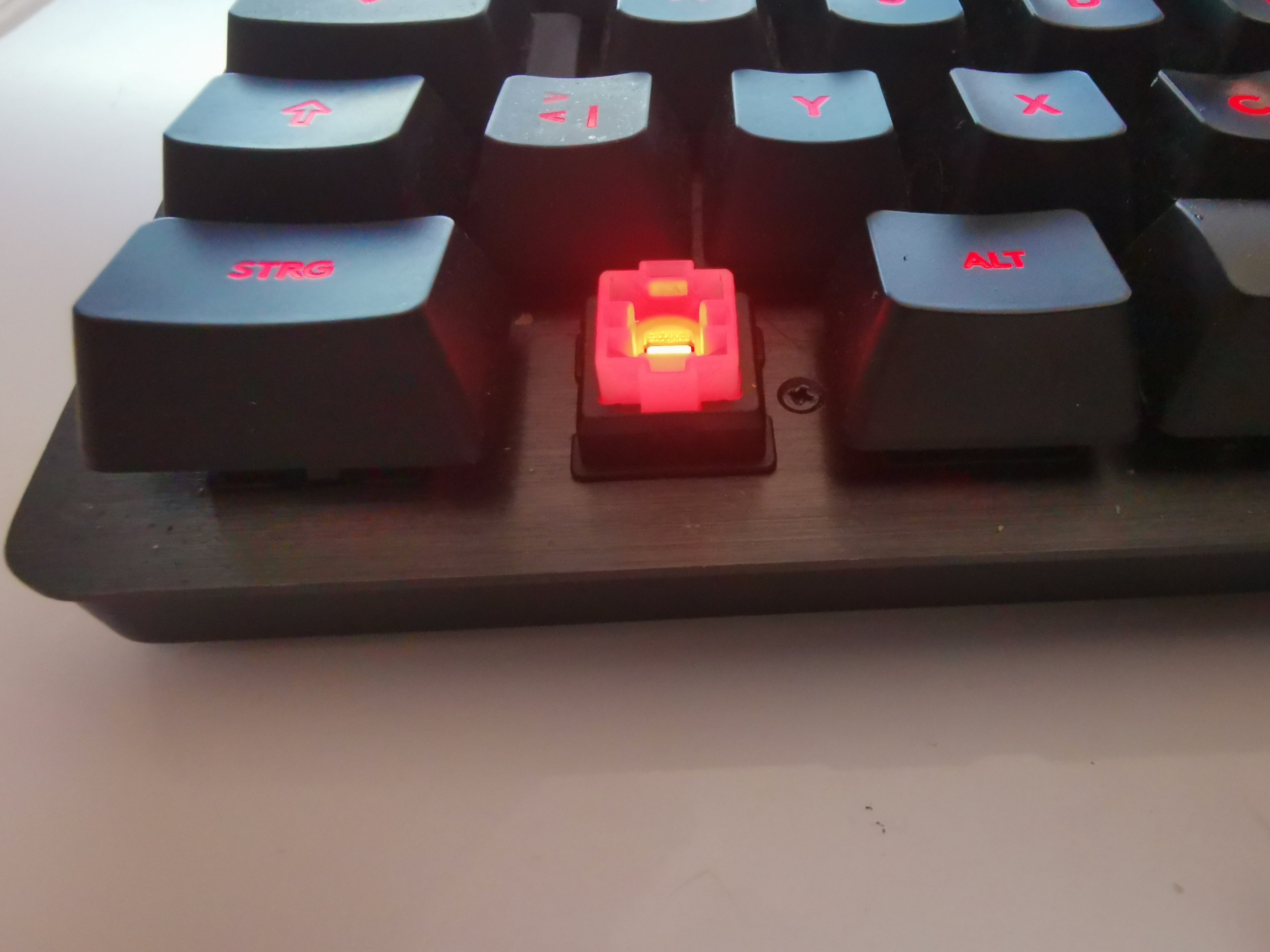 Eingestellt ist einfarbig, Hellblau, die Windows-Taste ist aber grün. Alles im Bereich blau führt zu einer grünen oder roten Windows-Taste bei dunkelblau ist die Windows-Taste so gut wie gar nicht beleuchtet, ein ganz schwaches rot.