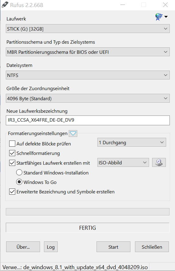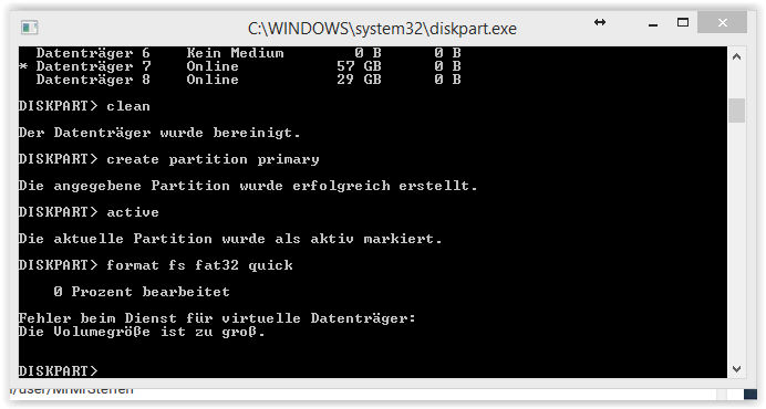 Ich möchte gerne auf einen USB Stick das Windows 8 laden um von überall zu arbeiten. Ich habe mir einen San Disk 64 GB USB 3.0 Stick gekauft, beim formatieren habe ich jedoch Probleme. Ich habe alles nach der Anleitung von https://www.youtube.com/watch?v=MIKLpr1MQAs gemacht. Die Fehlermeldung habe ich im Anhang.
