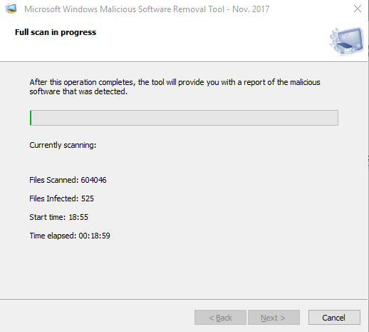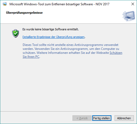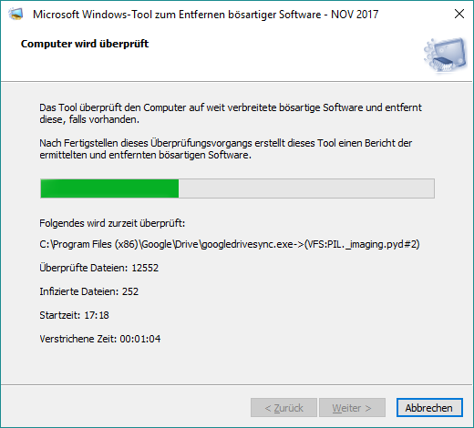 ich habe das aktuelle NovemberUpdate des Tools "Windows Tool zum entfernen bösartiger Software" von Micrososft installiert. Das kuriose: Während er scannt, findet er unzählige infiozierte Dateien, auf mehreren Rechnern getestet. Nach Abschluss des Scannens heisst es dann: alles okay, keine Infektionen gefunden.