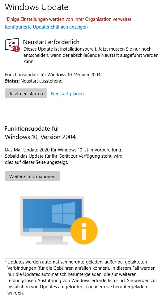 An einem PC steht seit dem 18.06 der Funktionsupdate zur abschließenden Installation durch Neustart an. An einem zweiten PC steht seit dem 10.06 ein Qualitätsupdate an. Diese konnte ich durch Tools, die Mausbewegungen erzeugen, bisher verhindern.