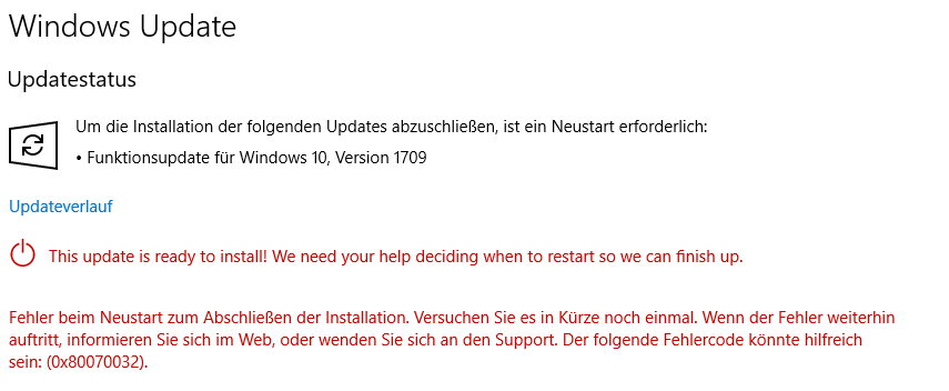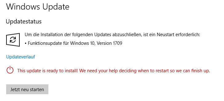 Mich irritiert auch der Text "Funktions-Update für Windows 10, Version 1709". "Für" würde ja eigentlich darauf hinweisen, dass 1709 bereits installiert ist, was aber nicht zutrifft!