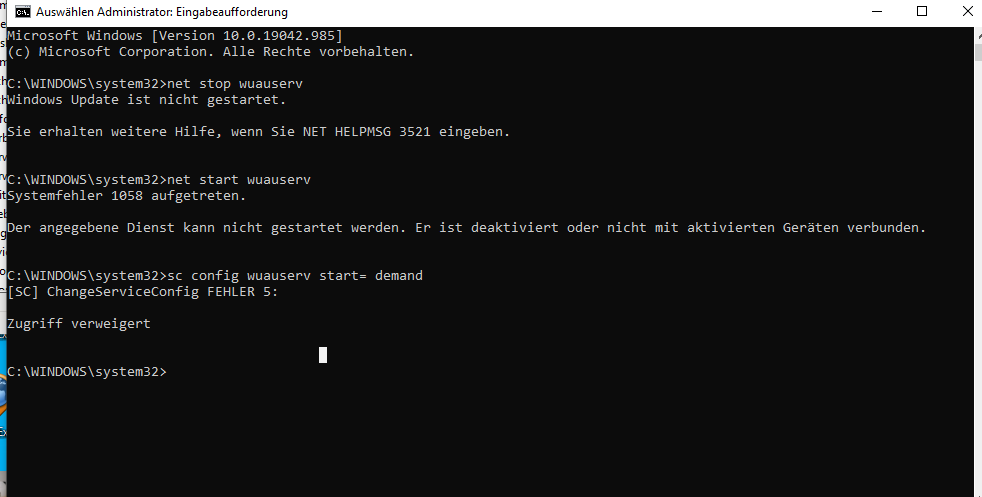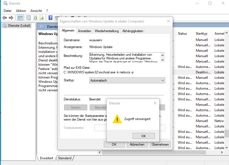 mir ist heute aufgefallen, dass mein Windows Update Dienst nicht mehr funktioniert. Meine Versuche es einzuschalten scheitern, weil ich ein Zugriff verweigert bekomme (Screenshot 1/2).