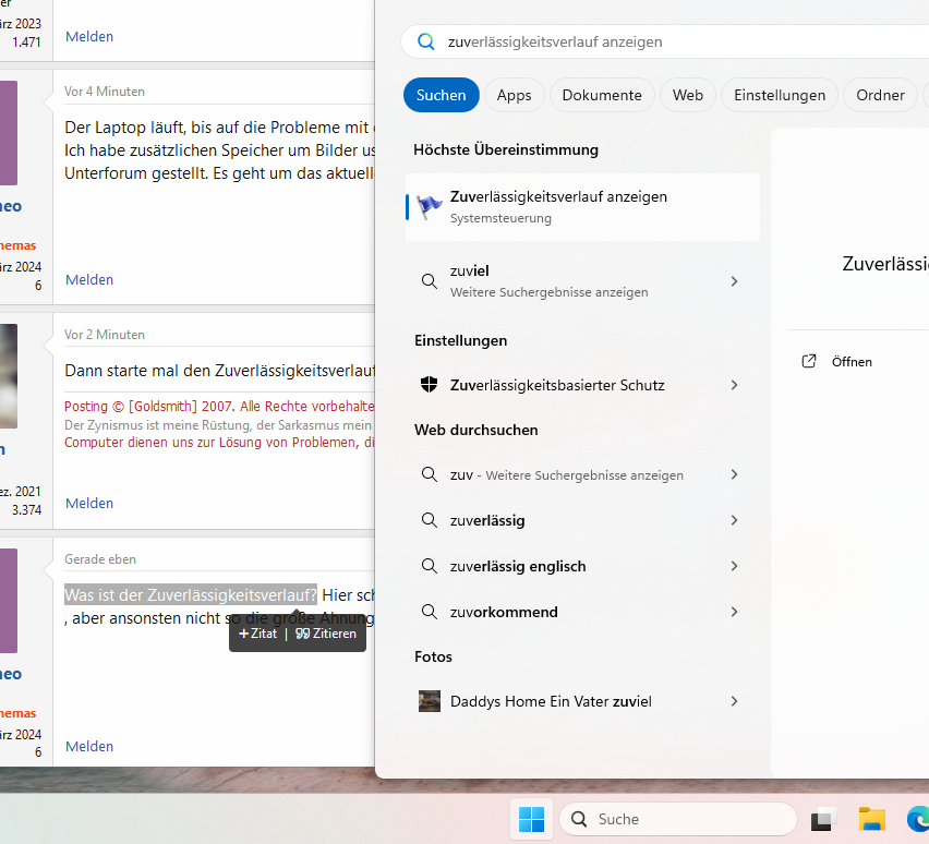 Geben Sie “Zuverlässigkeitsverlauf” in das Suchfeld ein und drücken Sie die Eingabetaste.