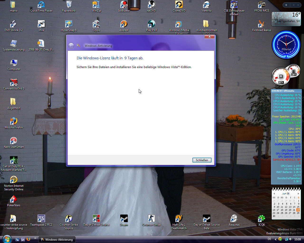 Hi ich hab da ein Problem und zwar Wird mir jedes mal wenn ich windows starte gesagt das ich meine daten sichern soll und eine beliebige Vista version installieren soll. Das habe ich aber bereits getan und auch den registrierungs schlüssel eingegeben deshalb weiß ich nicht was ich jetzt machen muß? kann mir da jemand helfen ?