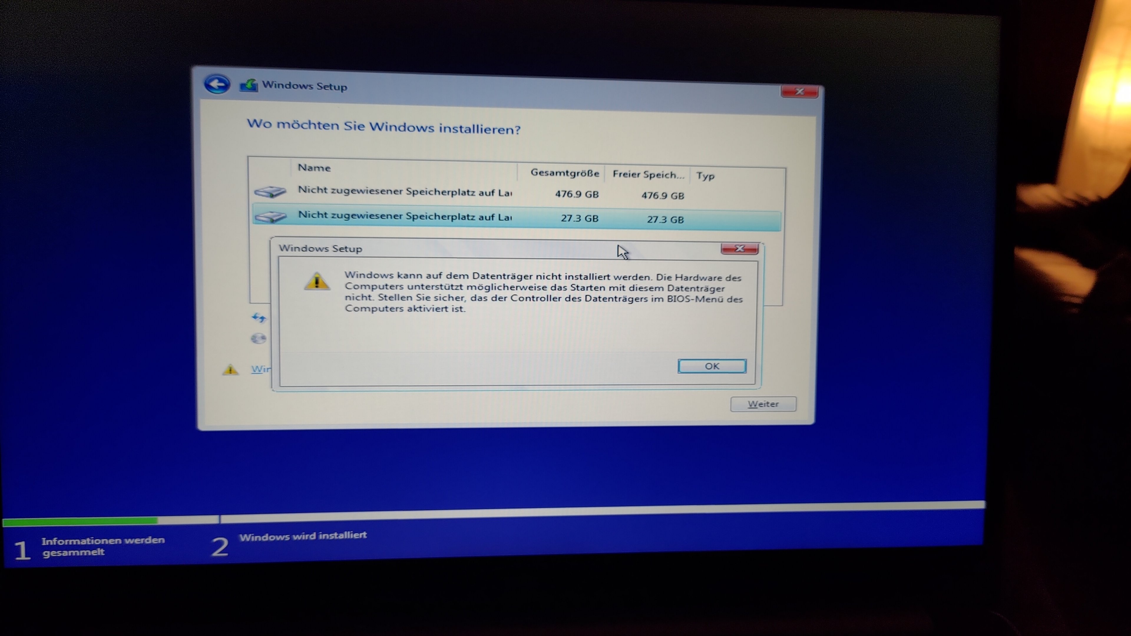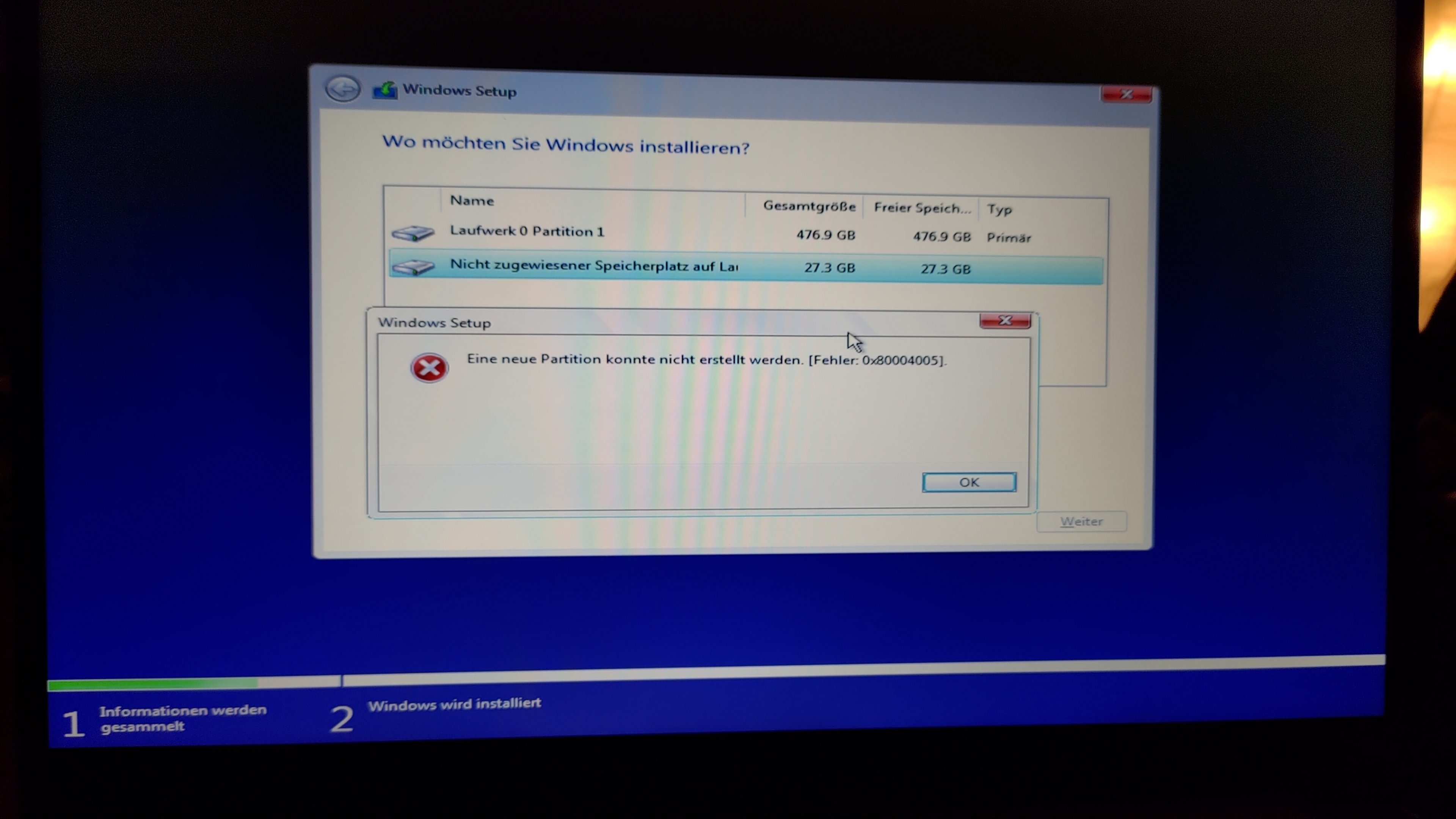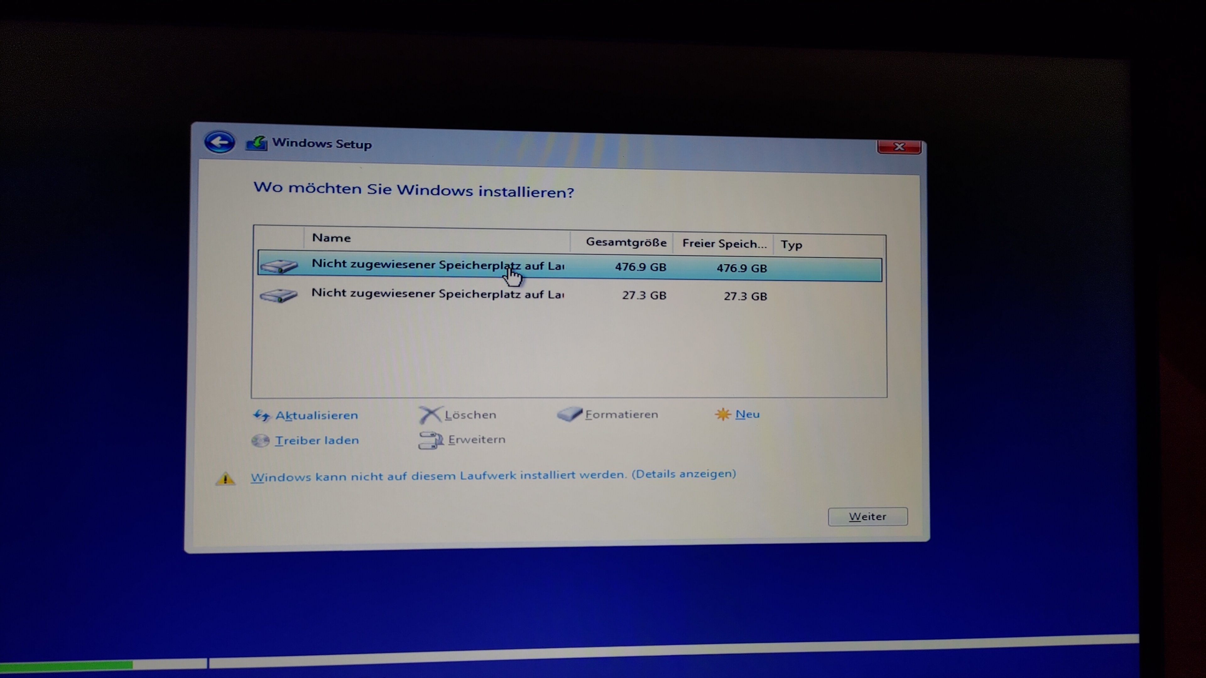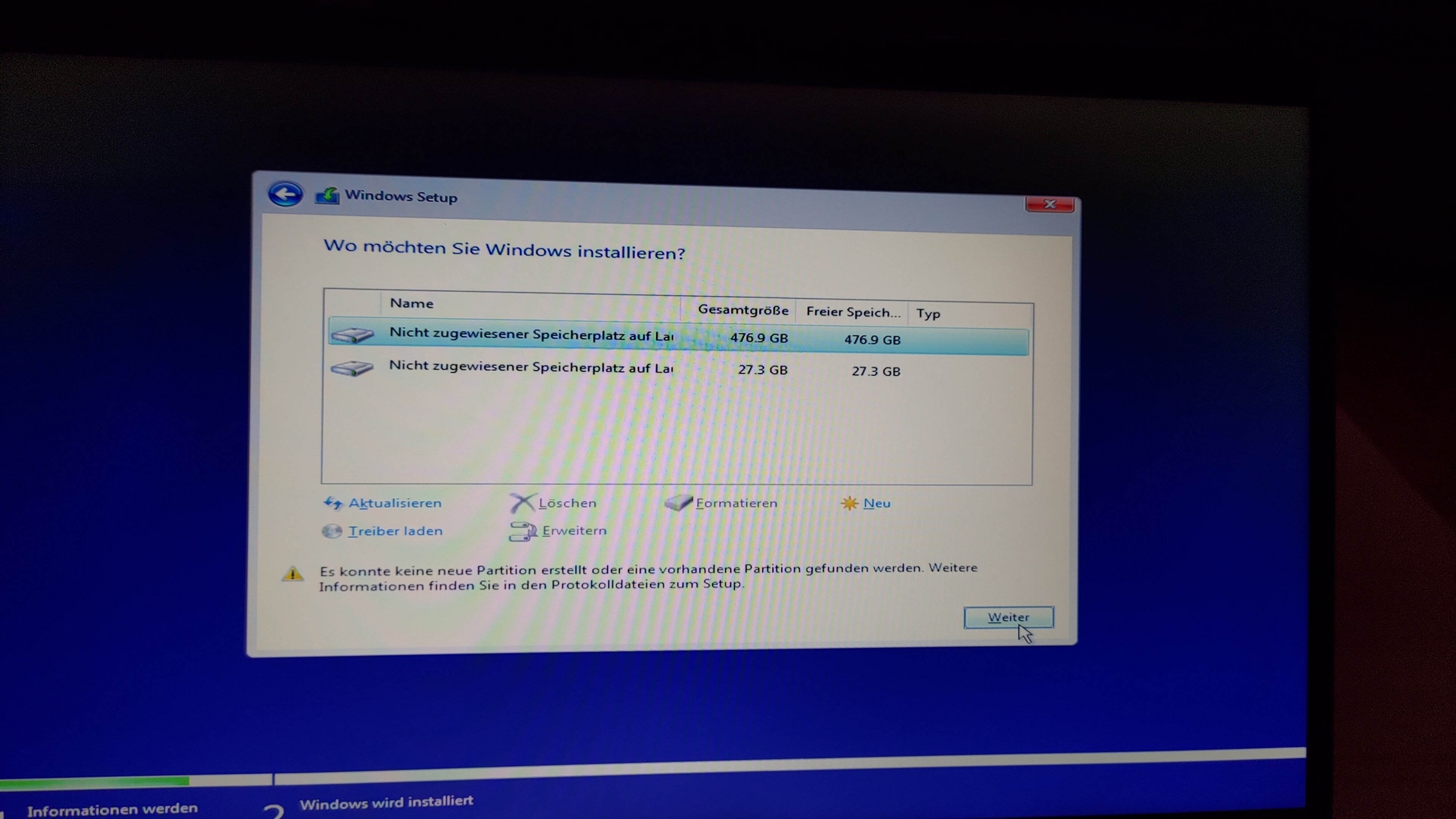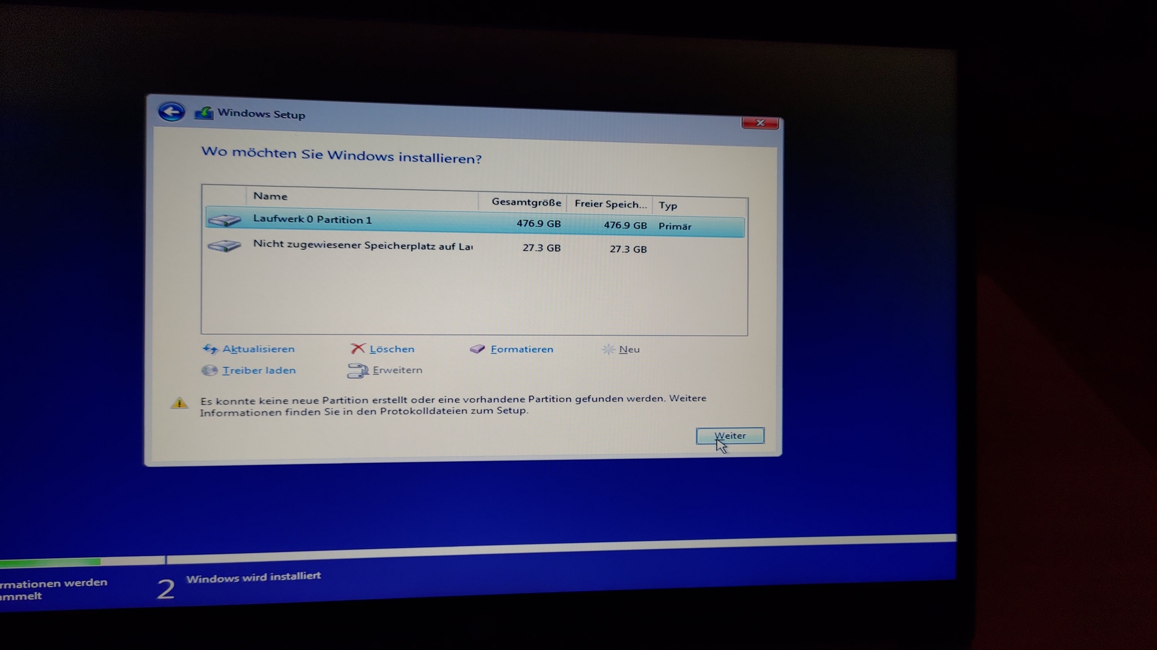Genau schnell... Nun die Festplatten gelöscht und neu erstellt. Jetzt will ich auf Laufwerk 1 Windows installieren. Er sagt mir nun