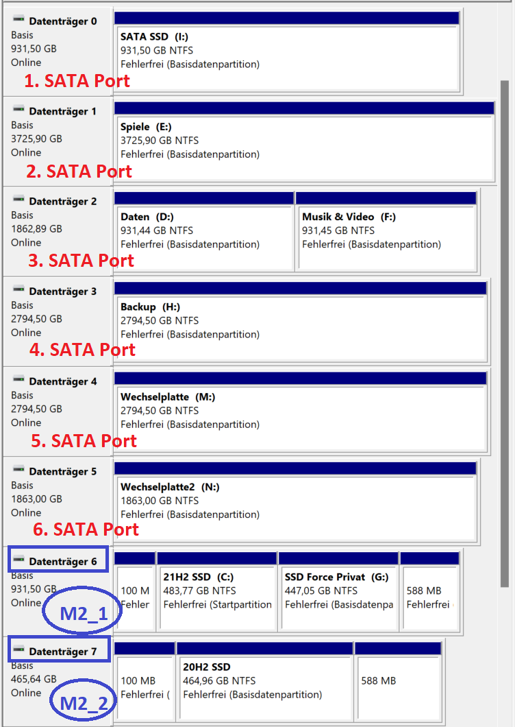 Eine M2 SSD ist unter Windows auch niemals mehr der Datenträger 0, wenn weitere SATA Laufwerke eingebaut sind. Die Datenträgerkennung einer M2 wandert dann an das Ende ... der Kette ... hinter allen SATA Laufwerken.